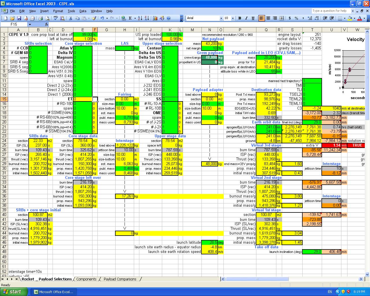 The following sheet shows how the payload in cell R46 of the Payload Comparisons sheet (for the Ares V (51.0.39) rocket) was obtained: